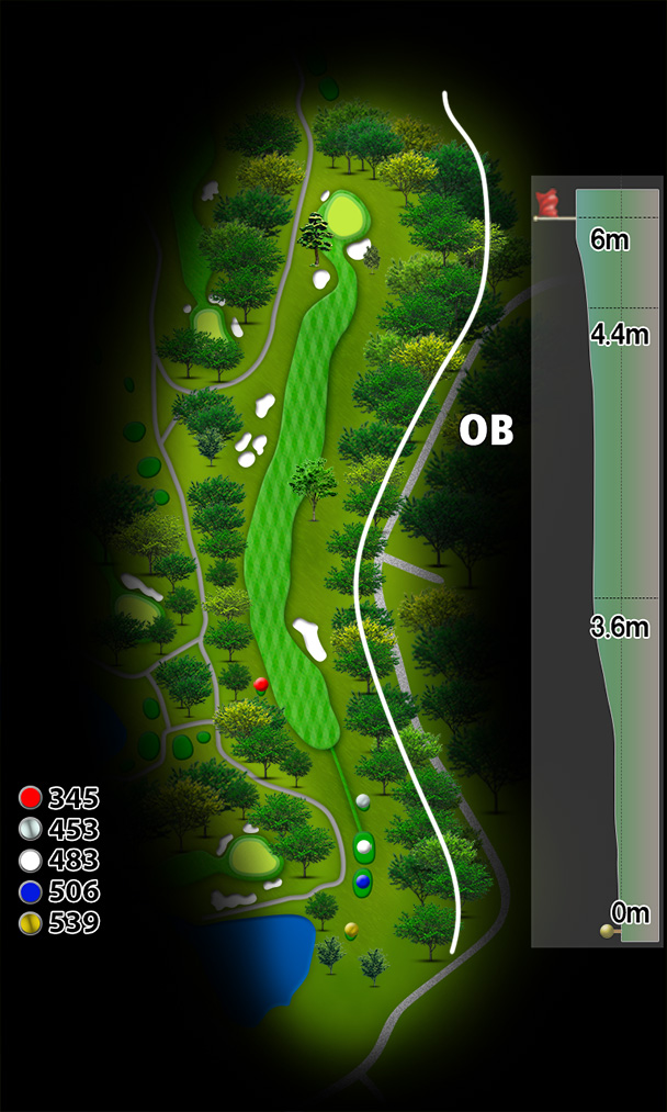 右バンカーの左サイドが狙い目だが、飛距離のでる方はバンカー越えで2オンのチャンスも。 セカンドショットは確実にフェアウェイキープ。2段グリーン。