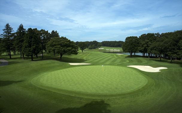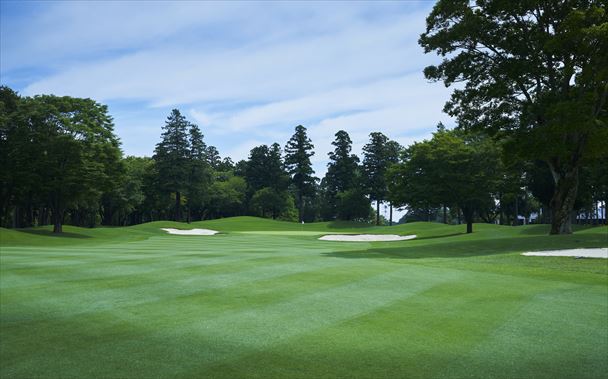 グリーン左手前に見えるバンカー方向が狙い目。 右サイドに置くと大きな木が邪魔をしてセカンドショットでグリーンを捉えにくい。